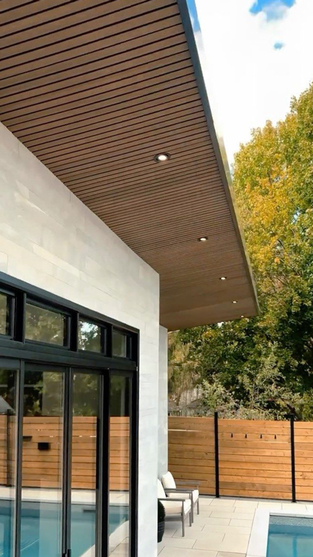 Единая фактура и цветовое решение материалов из ДПК создают цельное и гармоничное пространство. Горизонтальные рейки на фасаде перекликаются с направлением досок террасного покрытия, подчеркивая чистоту линий и современную эстетику.