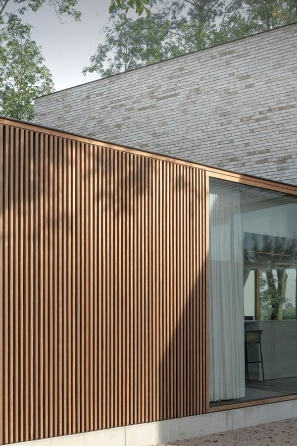 Вертикальные рейки на фасаде добавляют зданию глубину и объем. Такой прием подчеркивает современный стиль дома и в то же время гармонично связывает его с природным окружением.