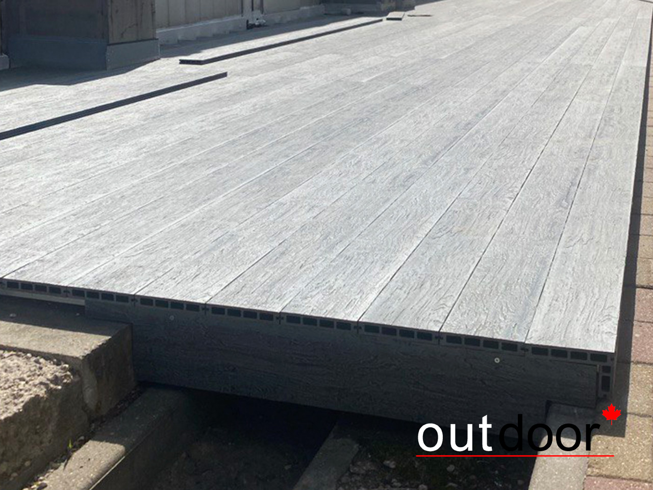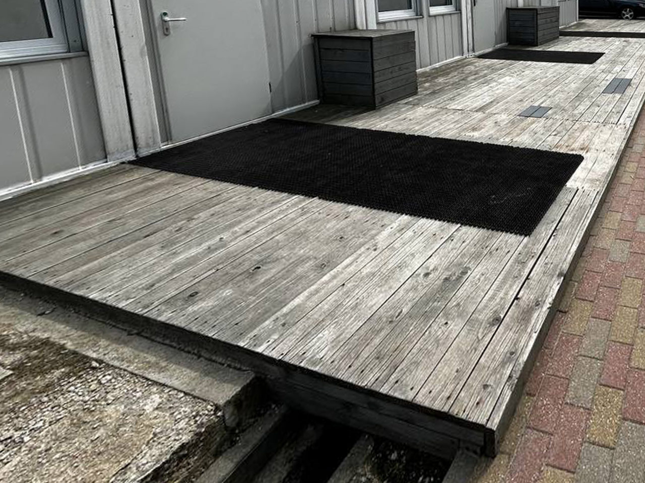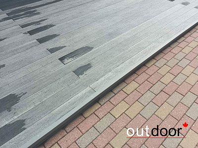 Демонтировать старый деревянный настил и обустроить новый из террасной доски ДПК. Также выполнить зашивку уличных тумб при помощи ДПК.