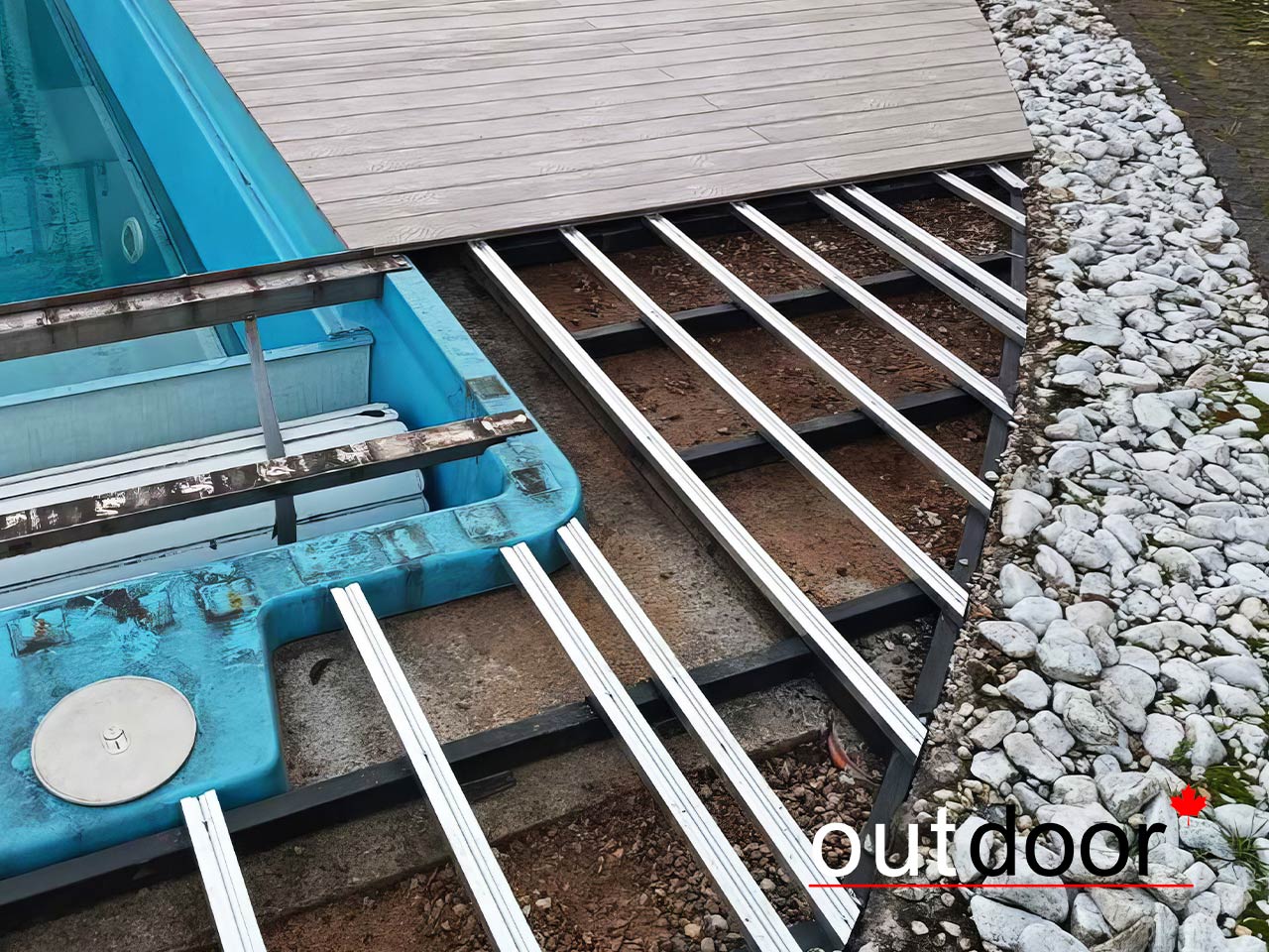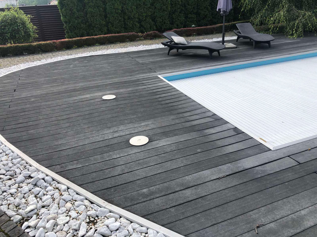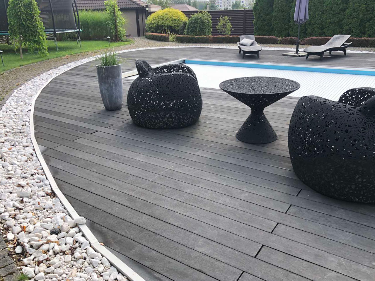 Заменить старое террасное покрытие у бассейна полнотелой доской из древесно-полимерного композита.