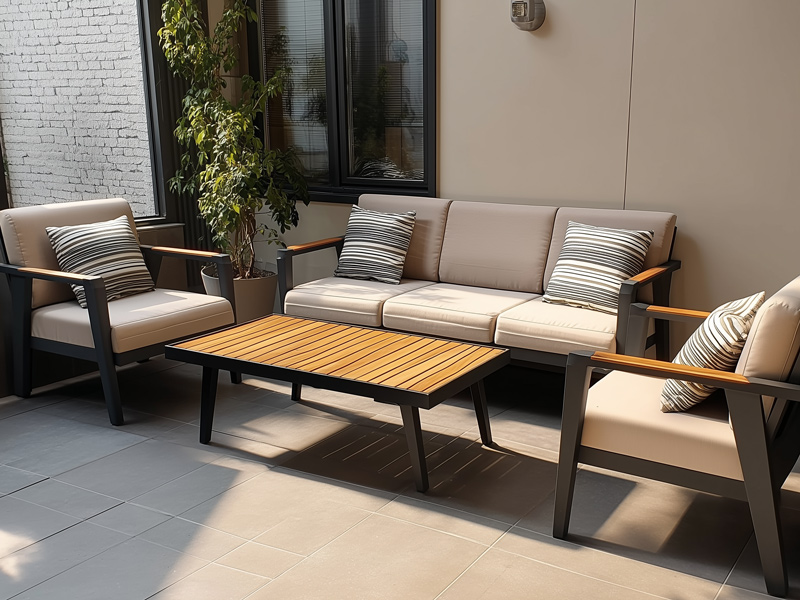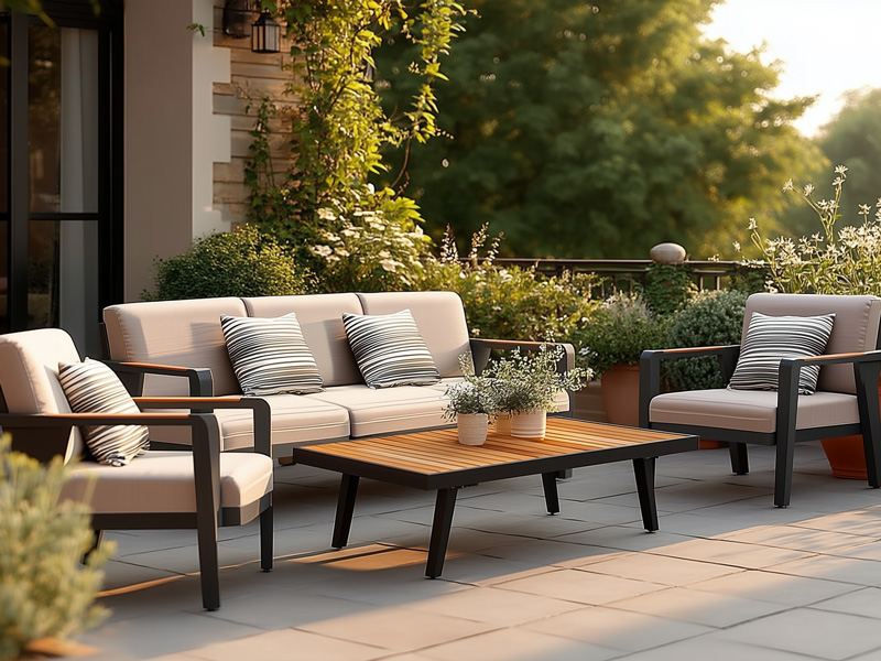 Лёгкая алюминиевая конструкция подчёркивает современный силуэт комплекта, превращая его в стильное и уютное место для отдыха на террасе.