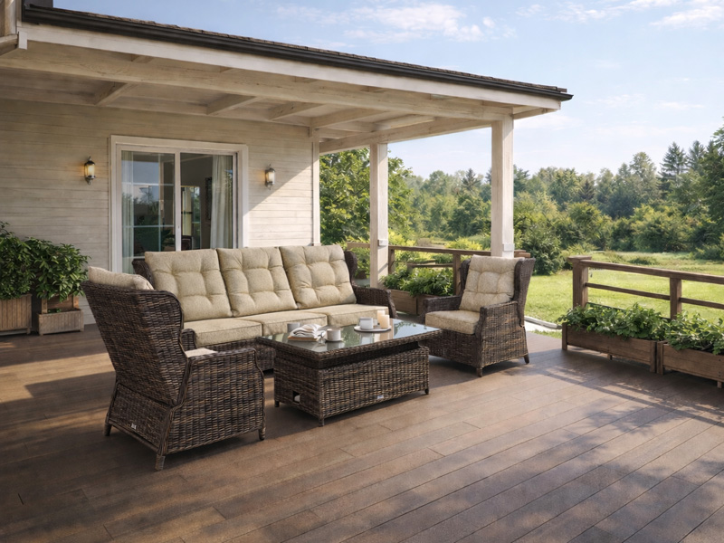 Плитка из керамогранита прекрасно сочетается с террасной мебелью из ротанга.