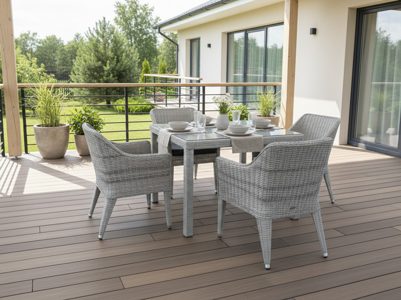 Терраса из ДПК гармонично впишется в ландшафтный дизайн, создавая изысканный баланс между современными и природными элементами.
