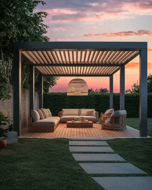 Регулируемая крыша из двойных алюминиевых ламелей легко адаптируется под различные погодные условия.