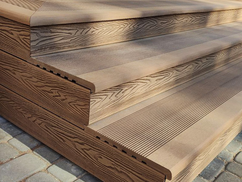 Ступени образуют единый архитектурный стиль с другими изделиями из ДПК.
