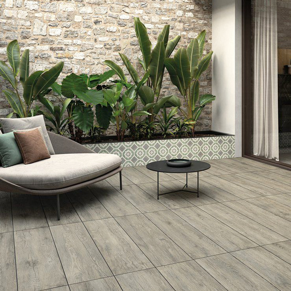 Керамогранит с текстурой дерева выглядит теплым и естественным, при этом формирует премиальную, идеально выверенную по геометрии поверхность.